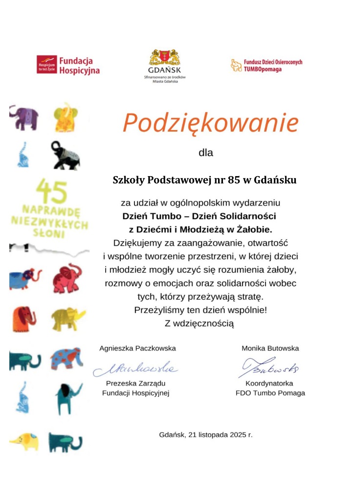 W dniu dzisiejszym do naszej szkoły spłynęły podziękowania, za nasze zaangażowanie w ogólnopolskie wydarzenie Dzień Tumbo – Dzień Solidarności z Dziećmi i Młodzieżą w Żałobie, które odbyło się 21 listopada 2025 roku. Był to dzień, w którym w naszej szkole nie tylko królował pomarańczowy kolor - był to dzień, w którym podsumowaliśmy całotygodniowe zaangażowanie, w tą jakże ważną i potrzebną akcję, która przypomina i uświadamia naszym uczniom, jak ważna jest otwartość oraz gotowość do rozmowy z dziećmi i młodzieżą o emocjach, żałobie i solidarności z osobami przeżywającymi stratę. W działania na rzecz tejże akcji włączyli się wszyscy uczniowie. Jednak na szczególne wyróżnienie zasługują uczniowie klasy 1A i 1H, którzy zorganizowali kiermasz słodkości. Serdecznie dziękujemy za wsparcie rodzicom, którzy dostarczyli przepyszne ciasta. Dziękujemy za wspólne przeżywanie tego ważnego Dnia. W ramach przeprowadzonej zbiórki charytatywnej na rzecz dzieci i młodzieży w żałobie wspólnie udało się nam zebrać kwotę 2 878,33 zł.