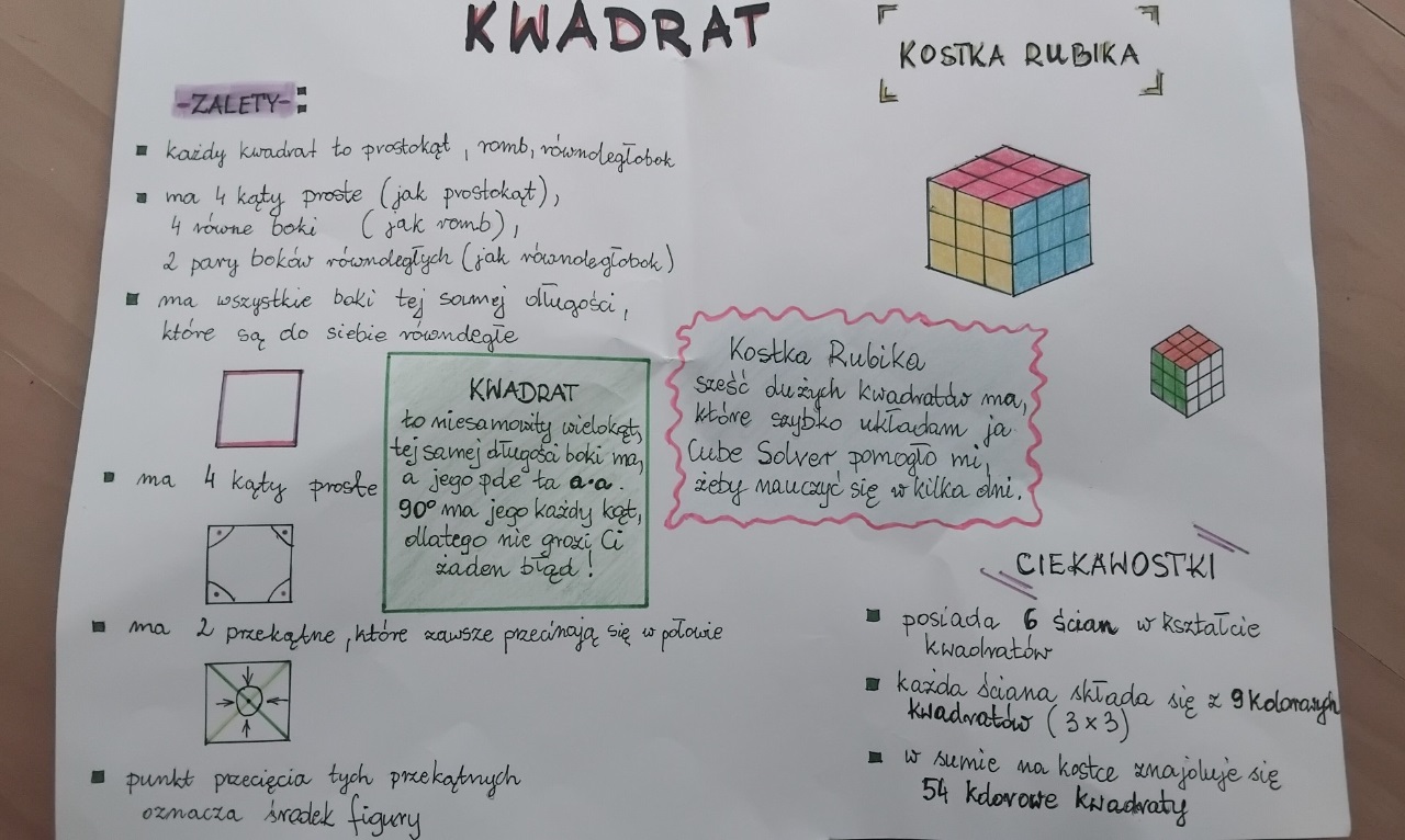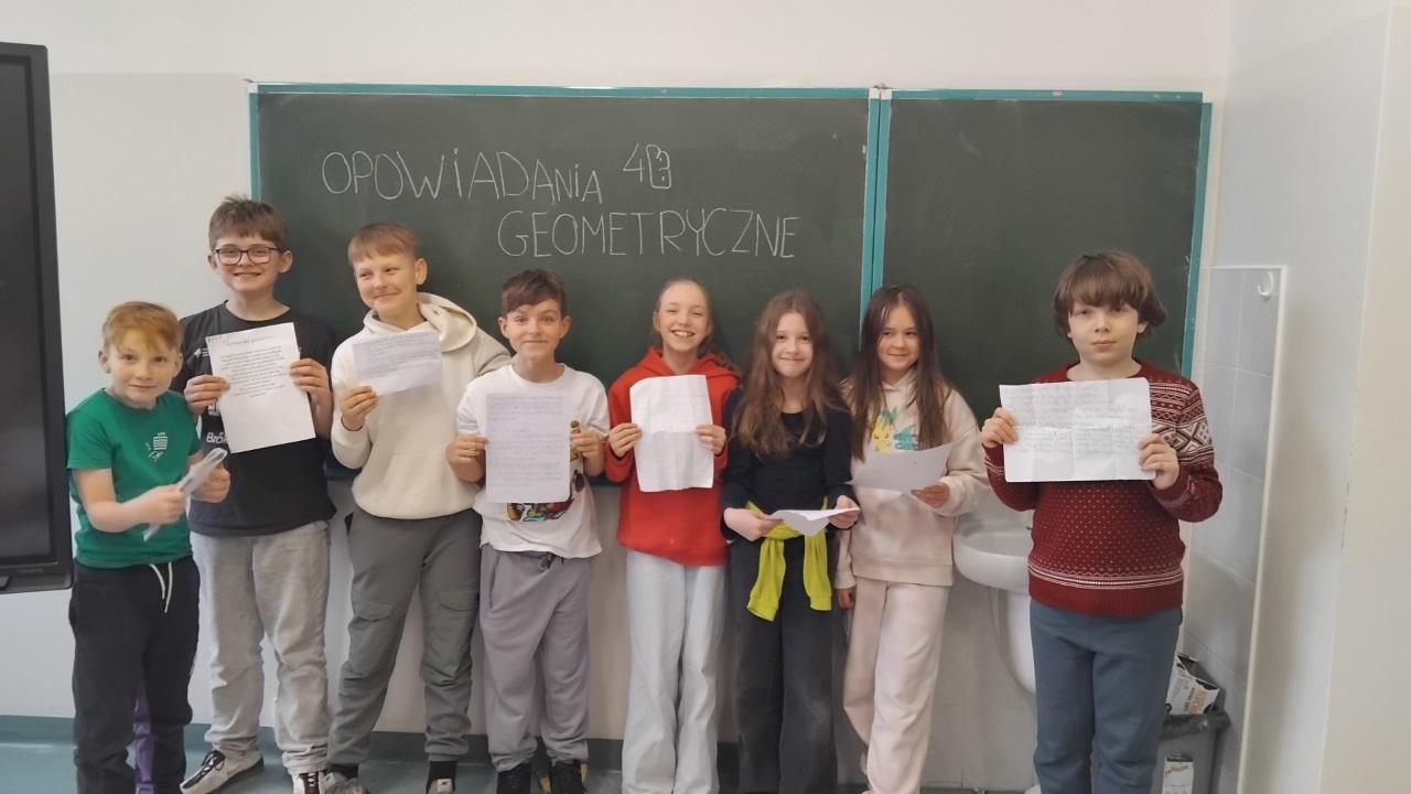 Uczniowie klas 4b/s oraz 5d stworzyli opowiadania geometryczne o poznanych figurach. Wszyscy spisali się na szóstki. Brawo!
